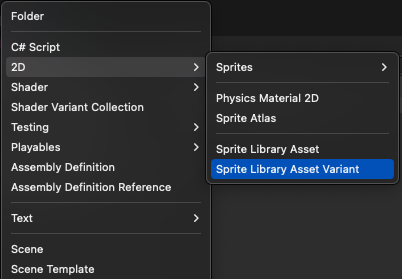 To create the Asset variant that inherits Categories and Labels from a selected Sprite Library Asset, first select the main asset in the Project window, then go to __Assets__ > __Create__ > **2D** > __Sprite Library Asset Variant__.