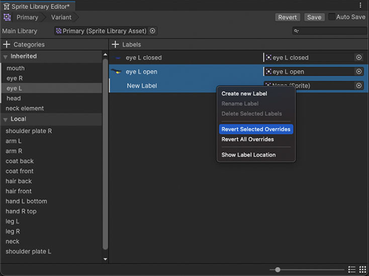 If the Label exist in the Inherited Category, it cannot be renamed to ensure that the Main Library and Assets that reference that Sprite Library contain the same Categories and Labels. To revert changes in the inherited Category, select the Labels you wish to revert and right-click to open the context menu and select __Revert Selected Overrides__ or __Revert All Overrides__ if you want to make the entire Category the same as it is in the Main Library.