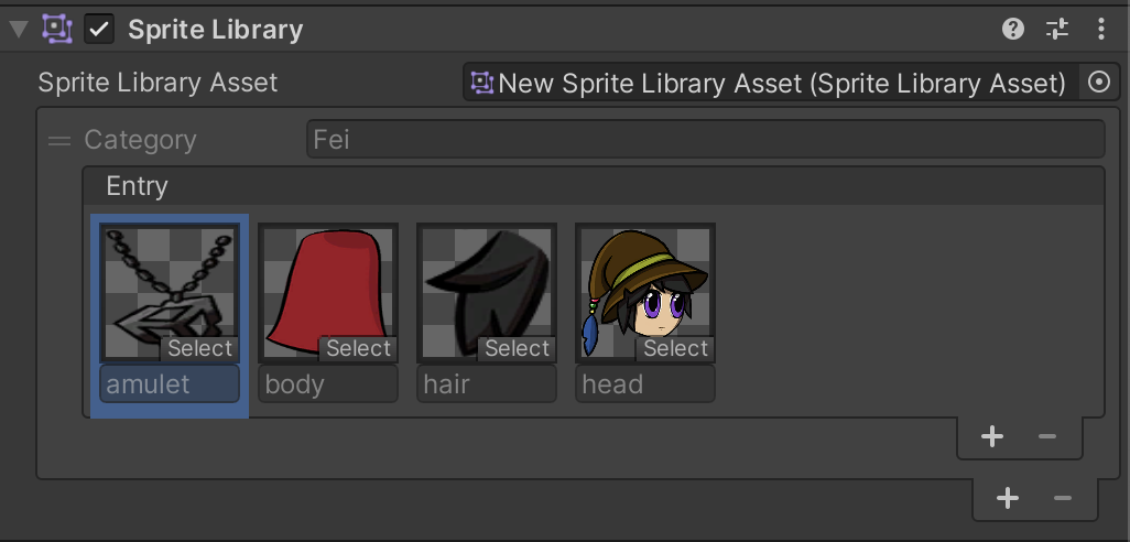 By assigning a Sprite Library Asset, the component’s Inspector shows a preview of the content in the Sprite Library Asset