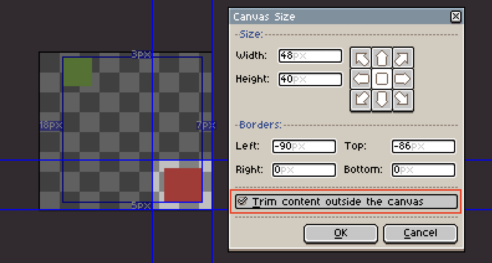 When modifying the canvas size, make sure the Trim content outside the canvas checkbox is checked. This way, the stored texture will be cropped to the specified size.